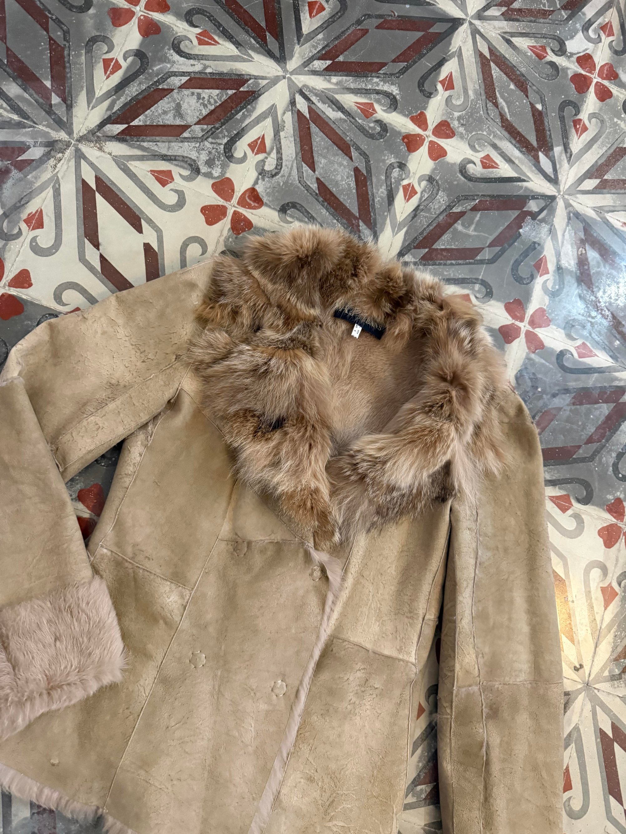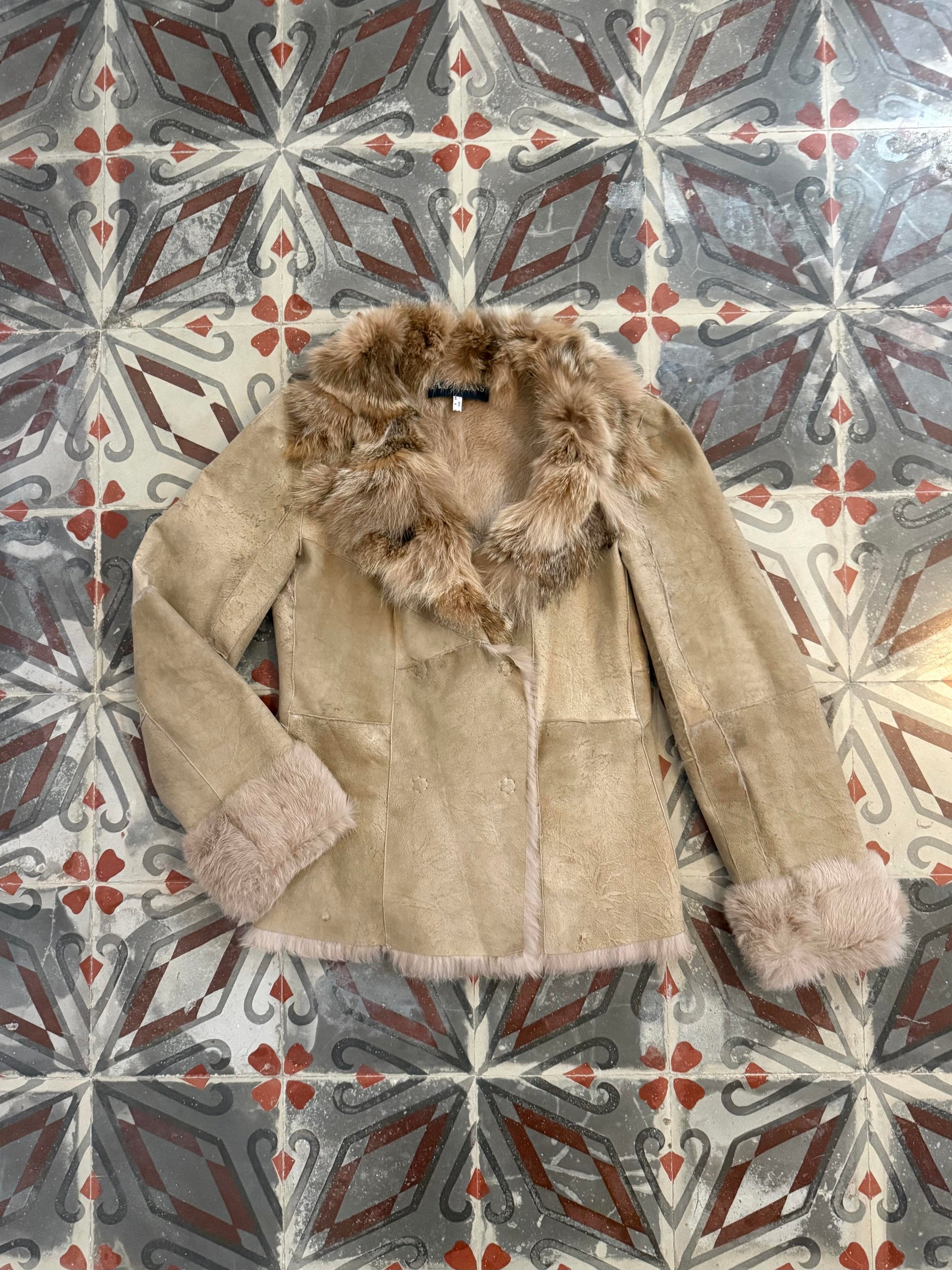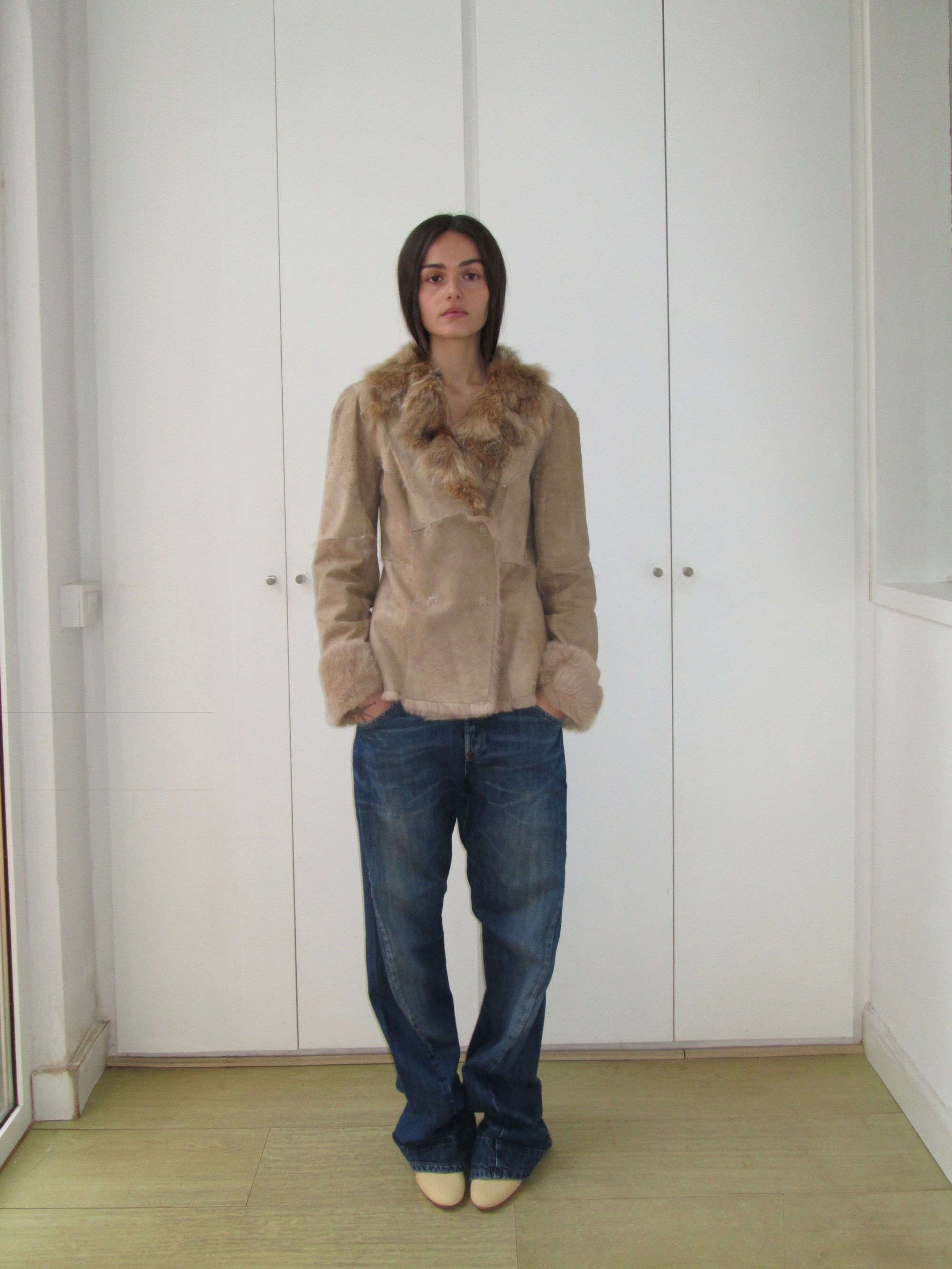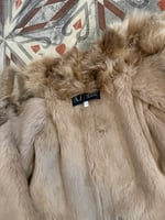 Beige suede jacket featuring rabbit fur collar, cuffs and interior.