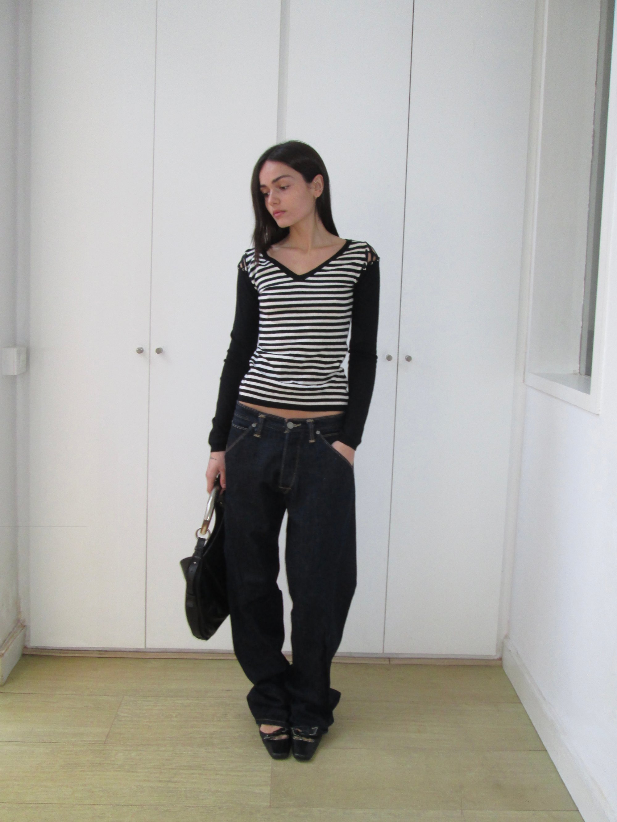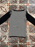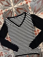 Black and white striped V-neck sweater featuring lace-up shoulder detailing.