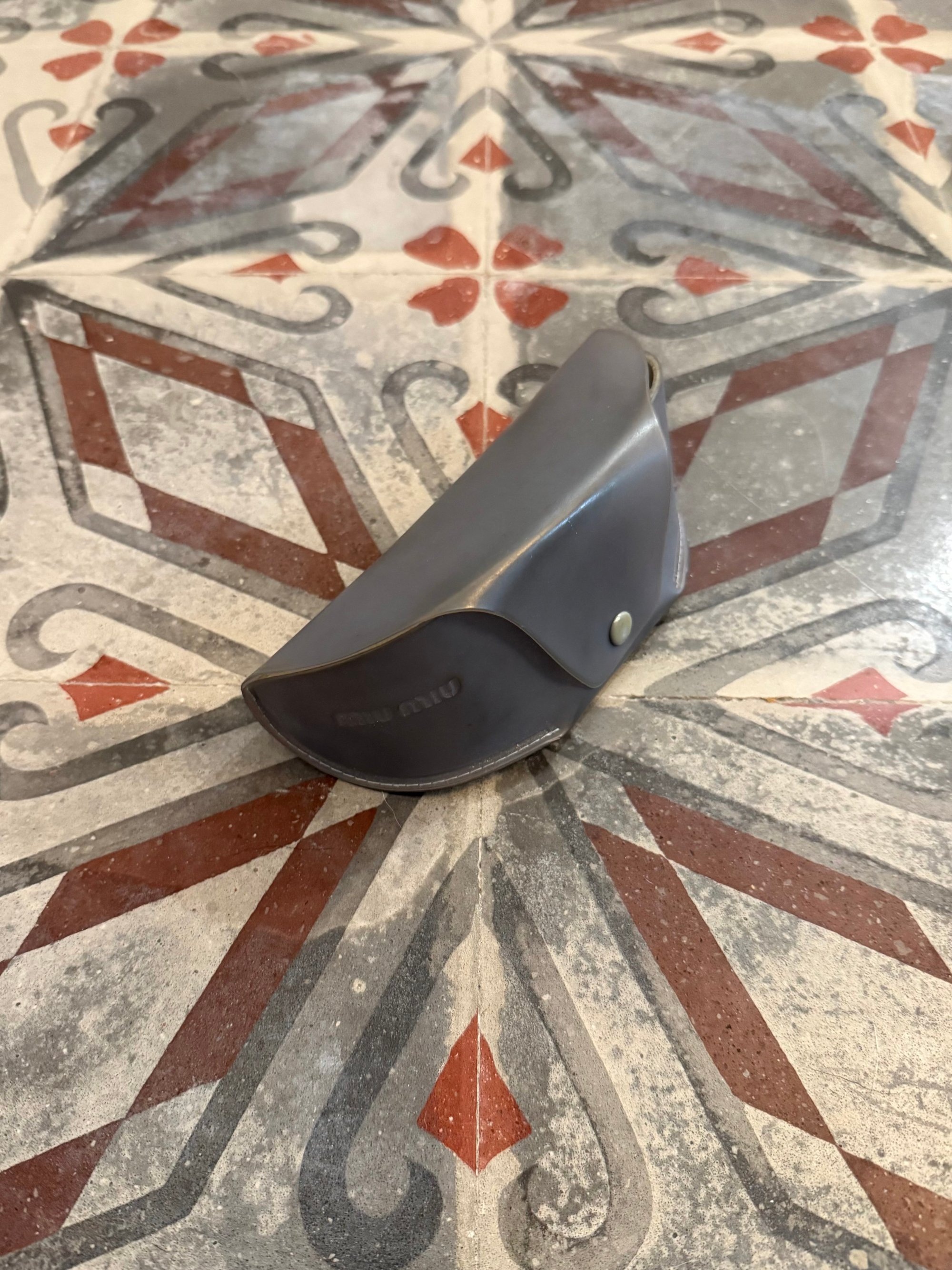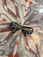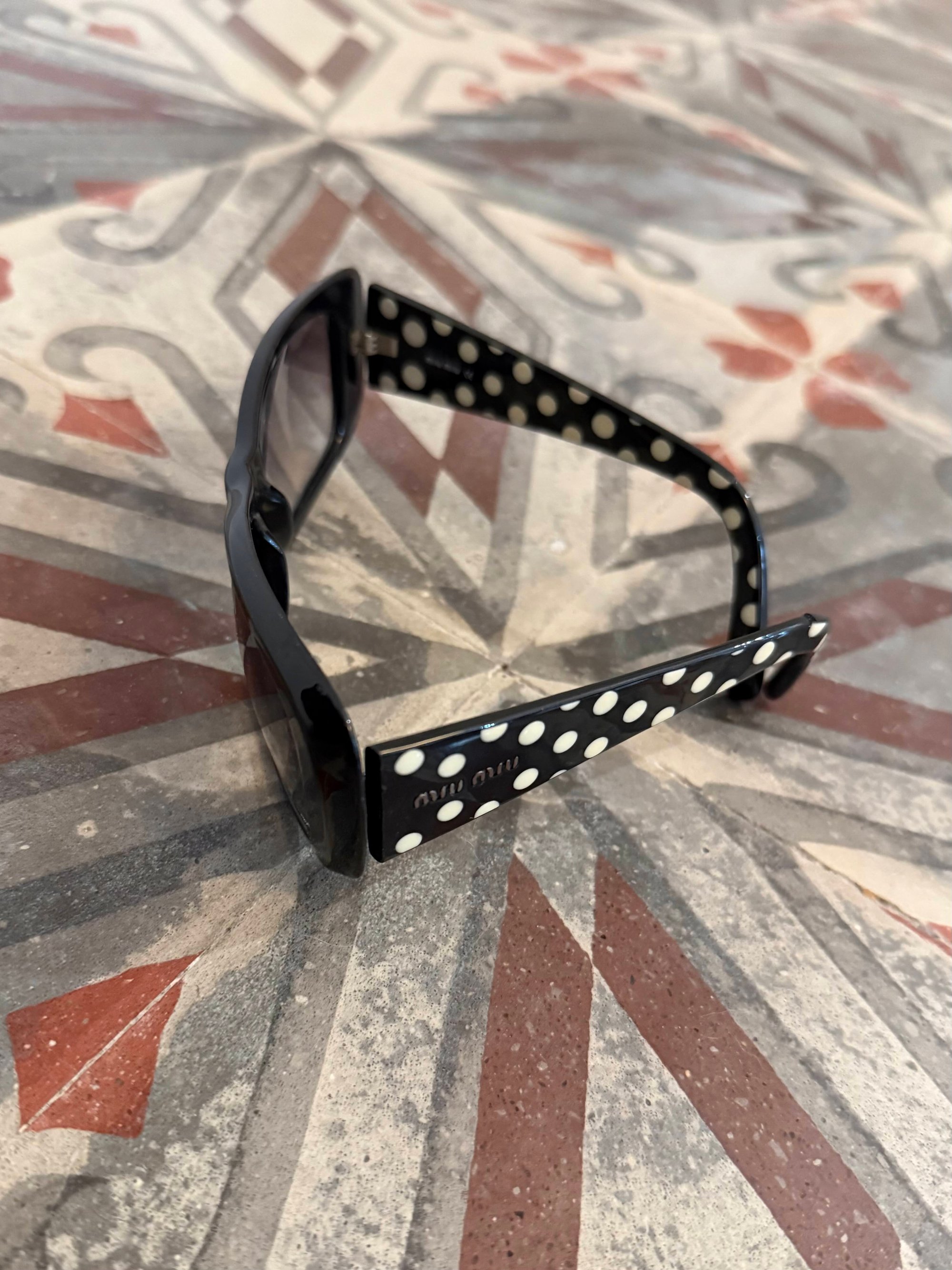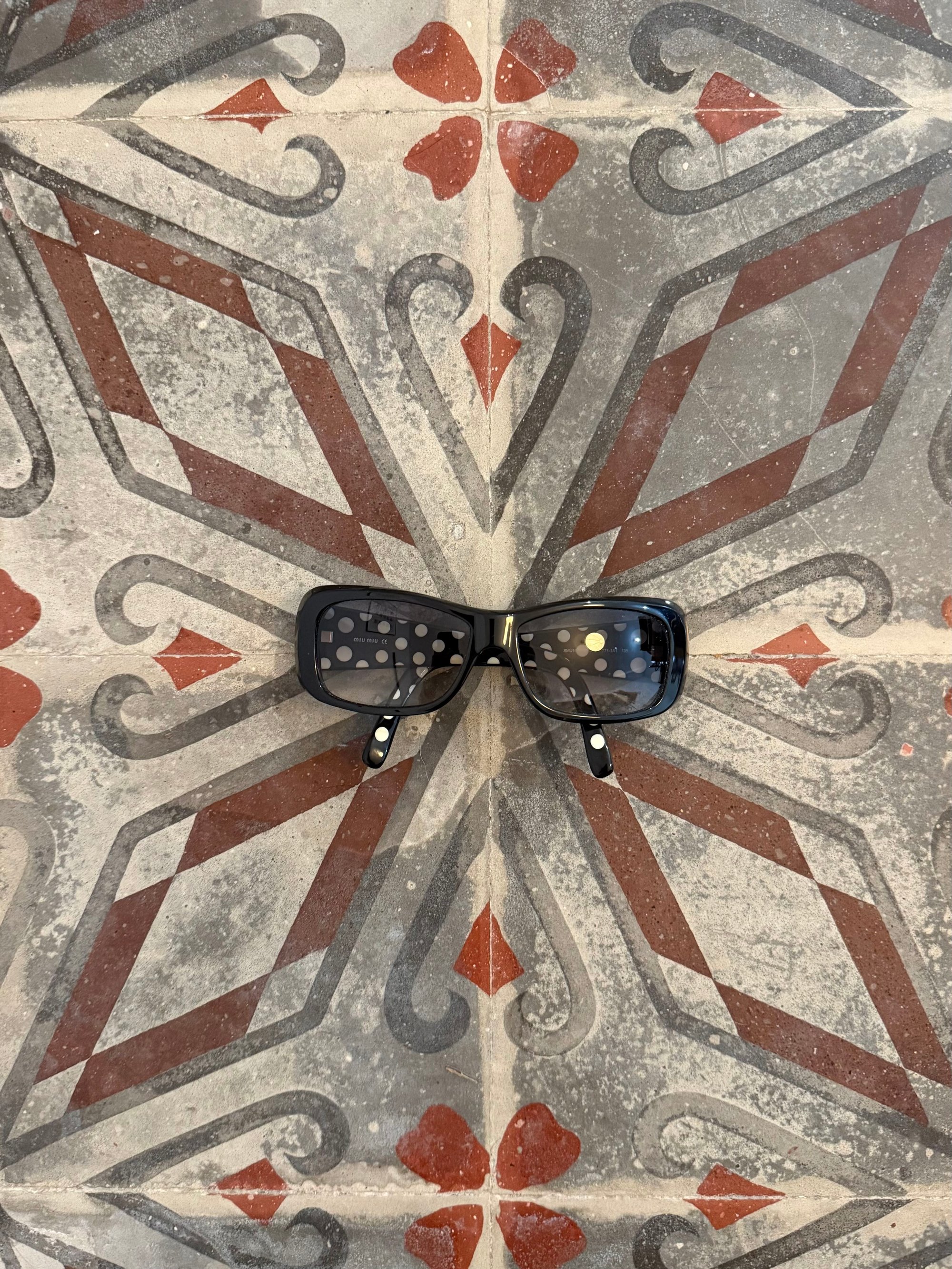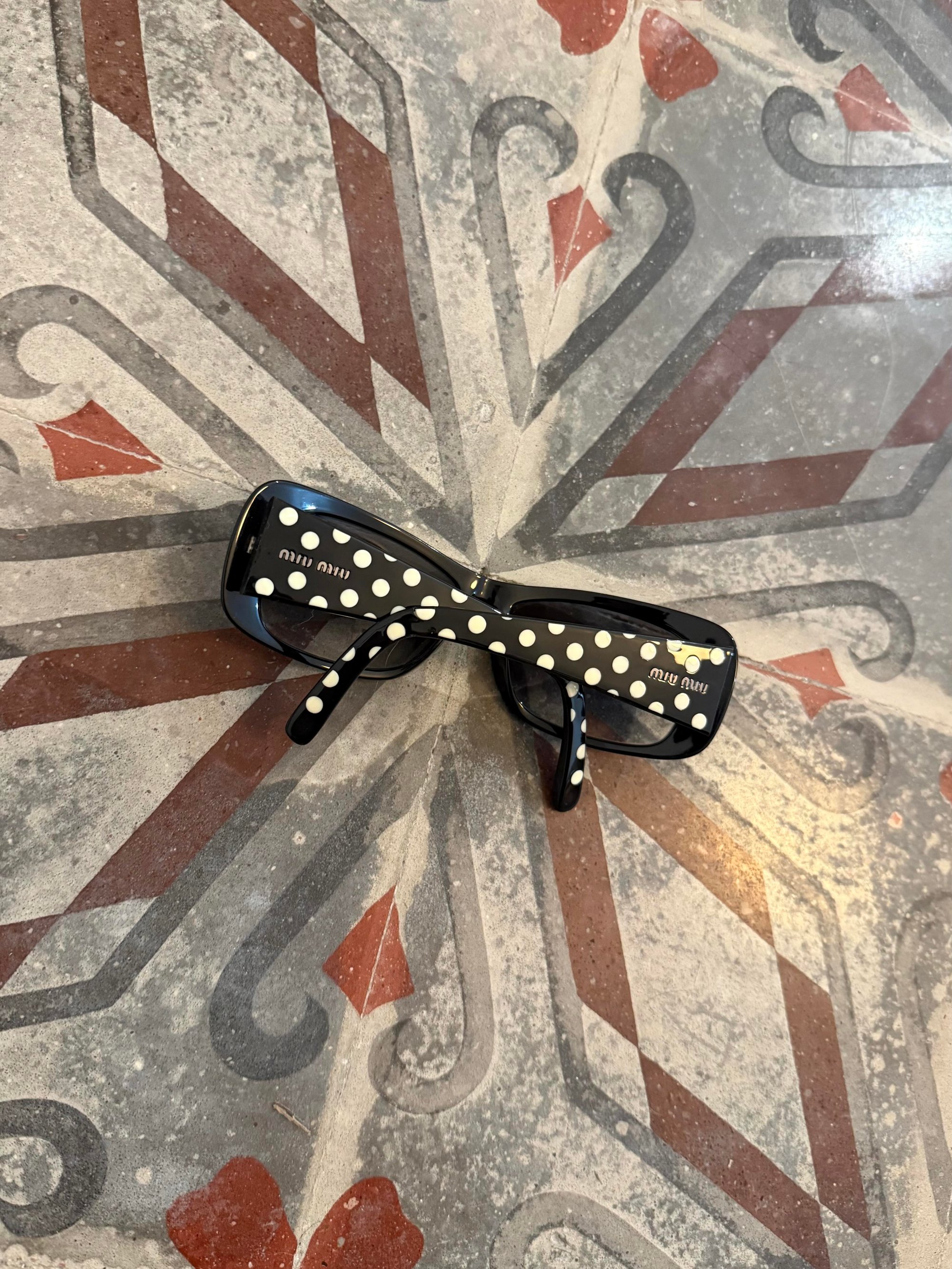 Black rectangle-shaped sunglasses featuring polka dot temples.