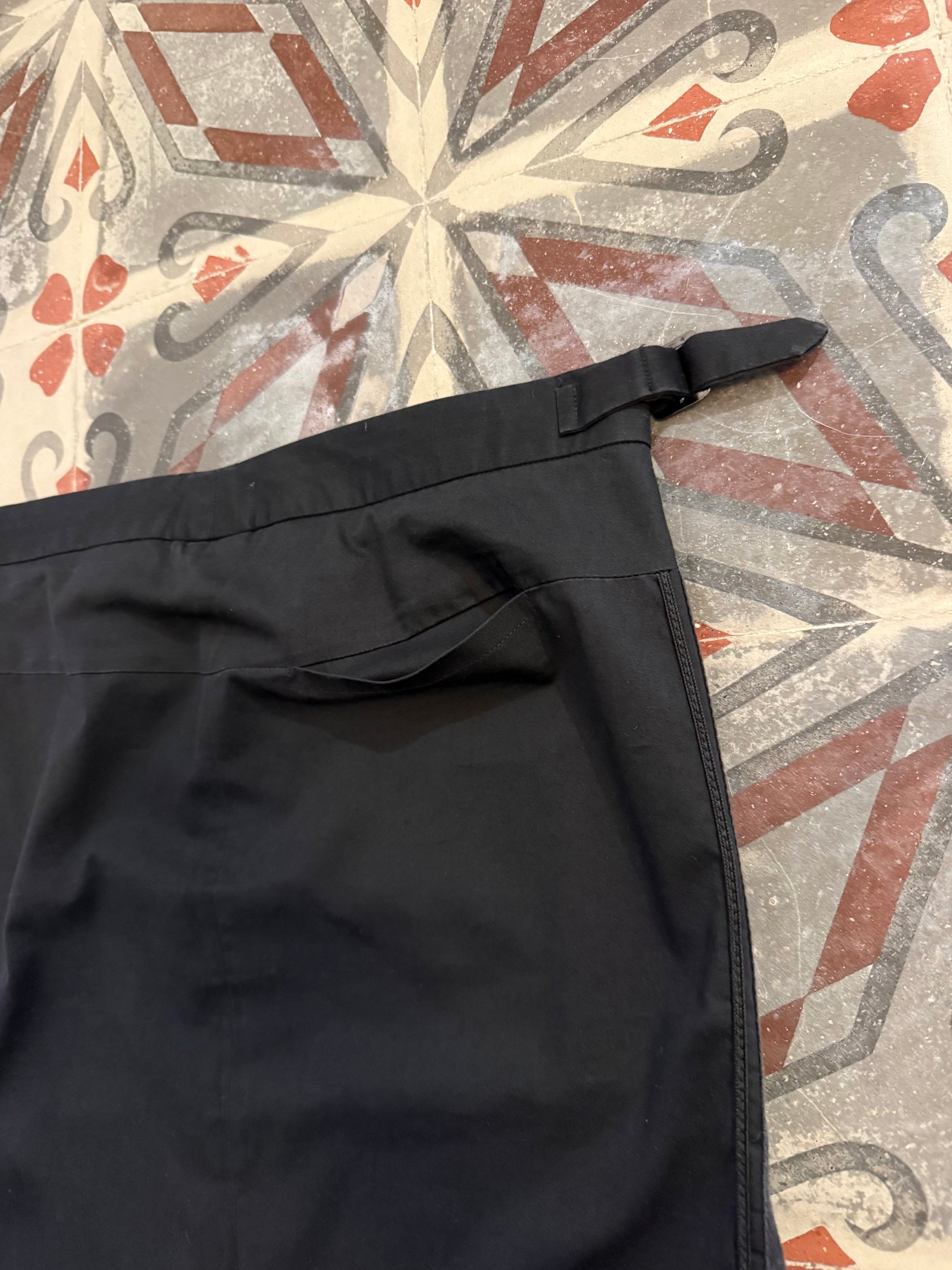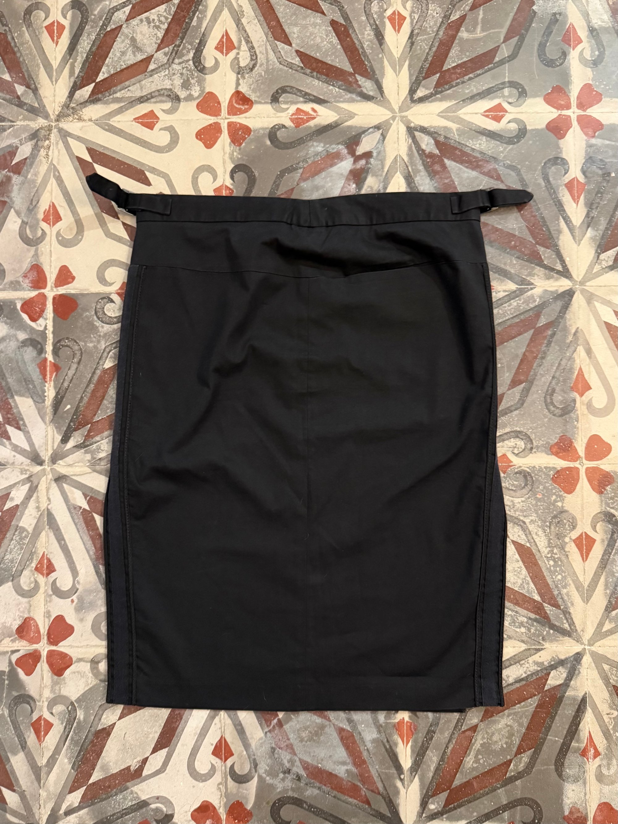 Black tailored midi skirt featuring waist buckles and side band detailing.